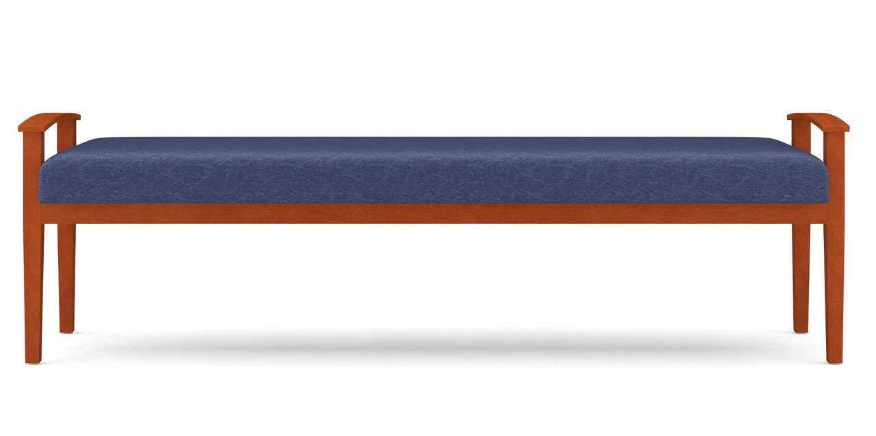 The Amherst Wood Three Seat Bench by Lesro offers stunning simplicity for reception area and lounge seating applications. The bench comes with wooden open arms and a wooden frame that are available in 9 wood finishes. Pictures of these finishes are in the description below. The bench also comes offered in over 200 different fabrics and vinyls. More fabric/vinyl options can be viewed in the links embedded in the description. The seat is manufactured with Lesro’s Matrex Support System, ensuring long-life comfort. A set of two black urethane arm pads can be added to this bench to provide additional padding on the wooden arms of this bench.Â