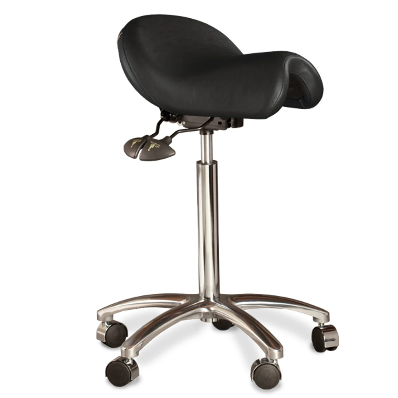 The Bambach Saddle Stool was created in 1988 by Mary Gale, an occupational therapist who was a lifelong horseback rider. She used riding in some of her treatment plans and began to see that patients with back issues could sit comfortably and completely unsupported on horseback. It is now well-known that sitting in a saddle allows the spine to return to it’s natural ‘S’ shape, preventing stress and pain on the muscles and skeleton. The Bambach Saddle Stool keeps the hips at the most ergonomic angle of 45 degrees, allowing for back and thigh muscles to be at their most relaxed. It also has a unique high-rise back design that provides added stability and comfort. Bambach Stools are highly sought after in the dental industry because of its ergonomic benefits, but it can also be used in any office setting. Check out the video tab above for more information.