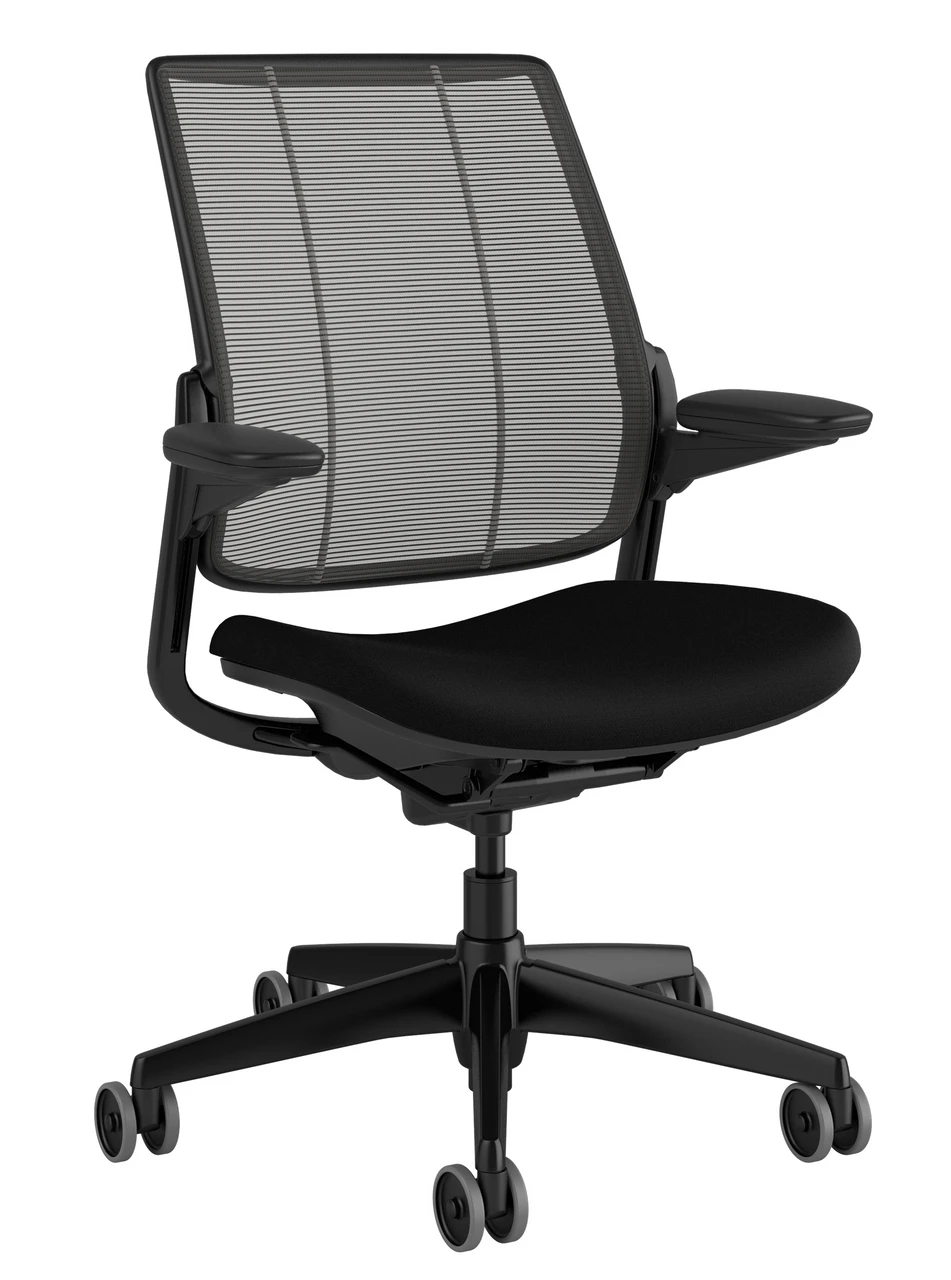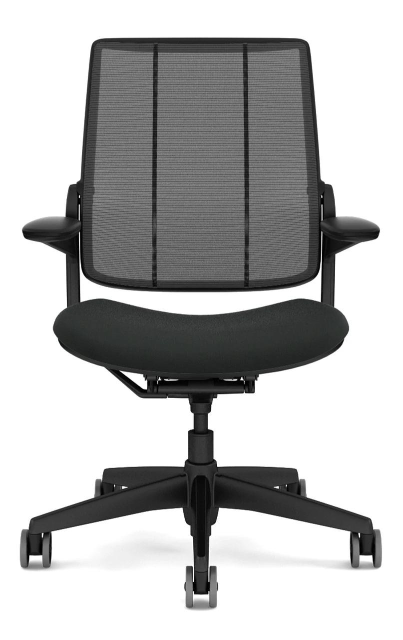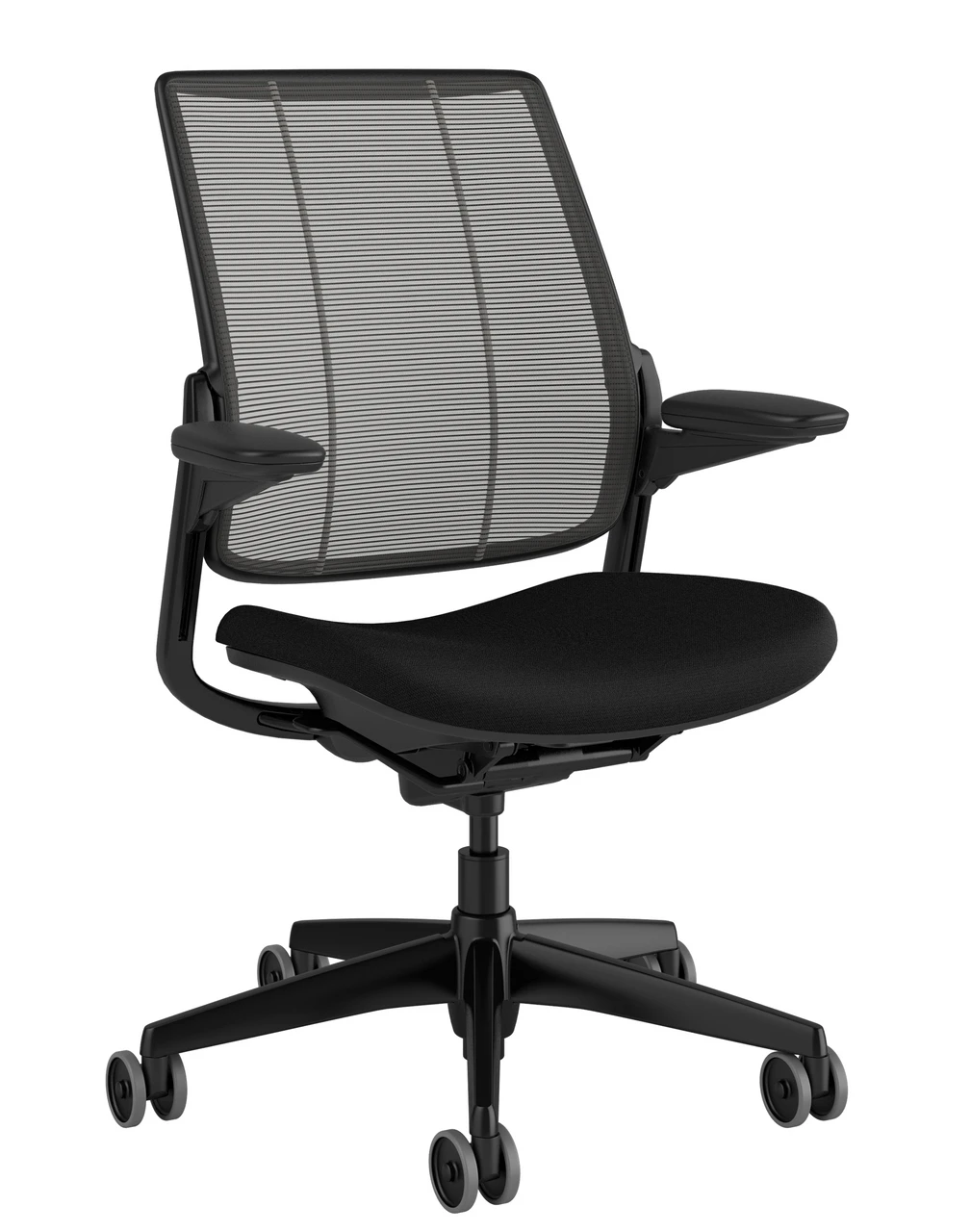Diffrient Smart chair is a high quality mesh task chair that is a striking addition to any office thanks to its linear, geometric design that easily integrates into any space. With a unique U-shaped back and minimal lines, the Diffrient Smart chair also features height adjustable ‘Duron’ capped arm rests that are attached to the back of the chair, so they move with the user for dynamic support. The black epoxy finish ensures Smart’s longevity, while its automatic recline supports every body type that sits in it. Diffrient Smart’s revolutionary tri-panel mesh backrest offers immediate support and allows the user to engage in a healthy, ergonomic posture. The Humanscale Diffrient office chair is warrantied for 15 years by Humanscale and is certified for 24/7 multi-shift usage for sitters up to 300 pounds.