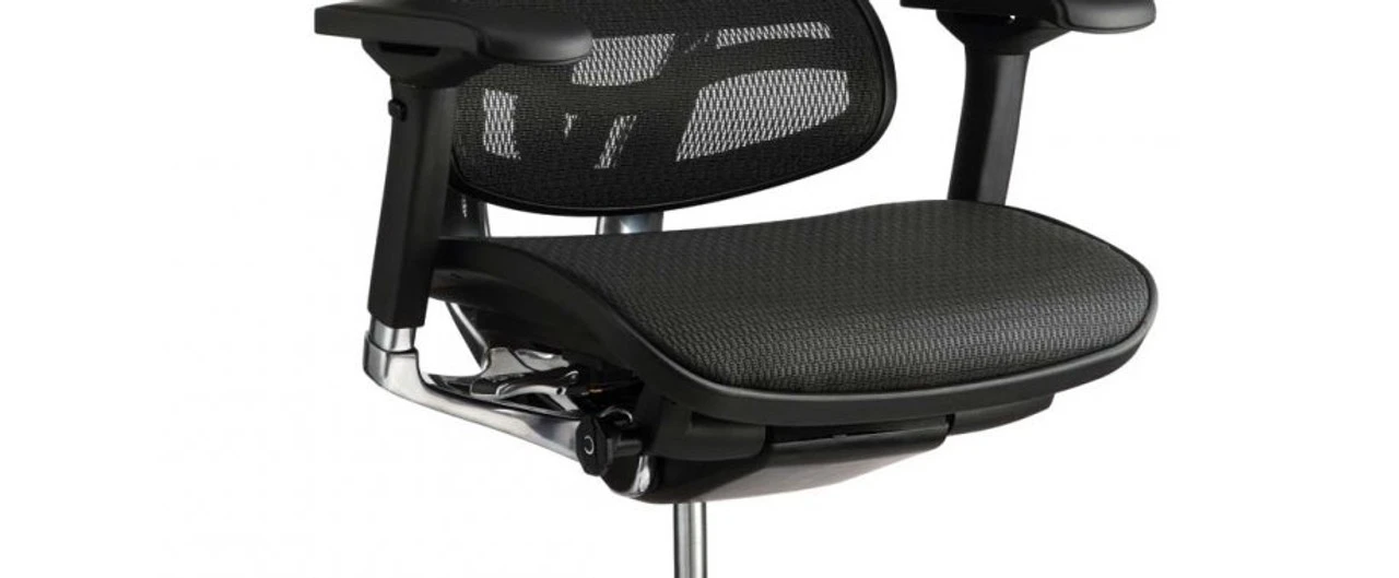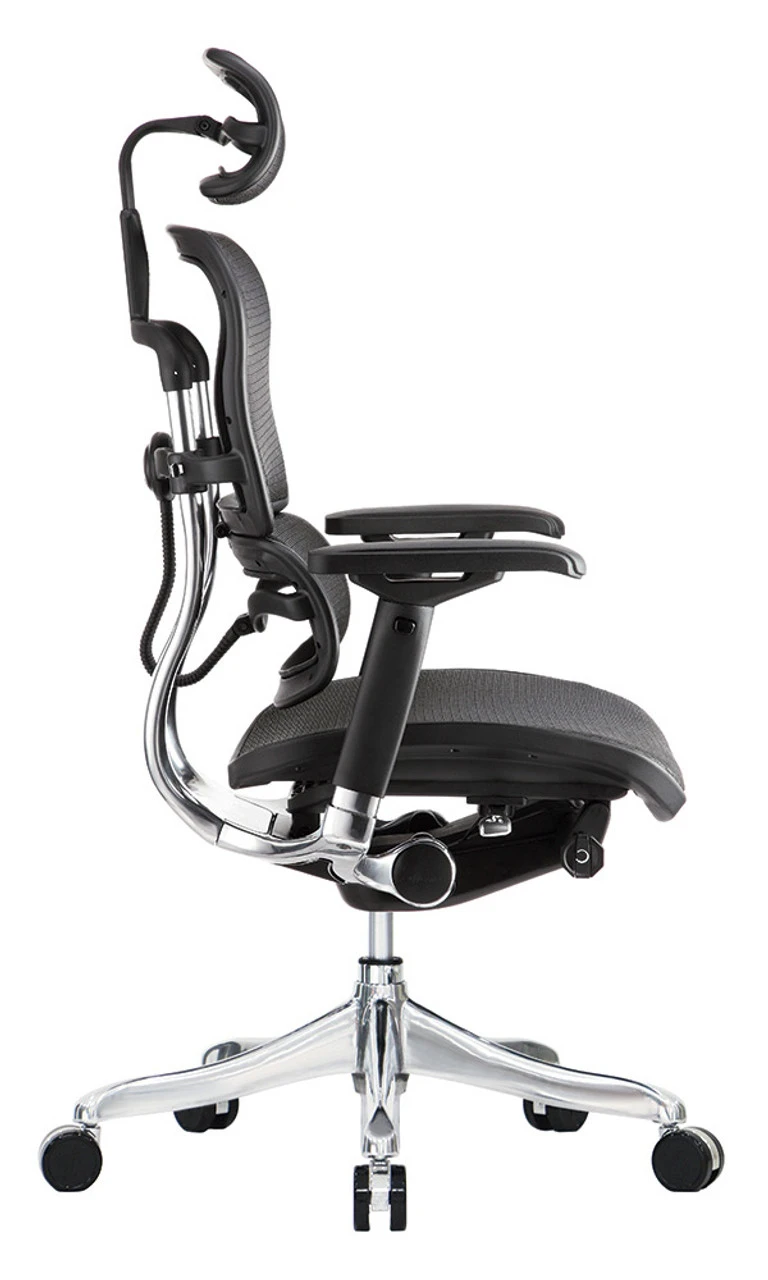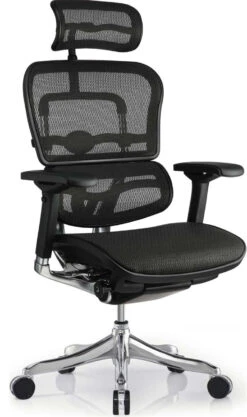 Premium mesh seat and back executive chair with headrest. Polished aluminum base and heavy duty casters. Cleaner seat under-body. Single toggle control for functions. The Ergo Elite is 97% post-use recyclable.