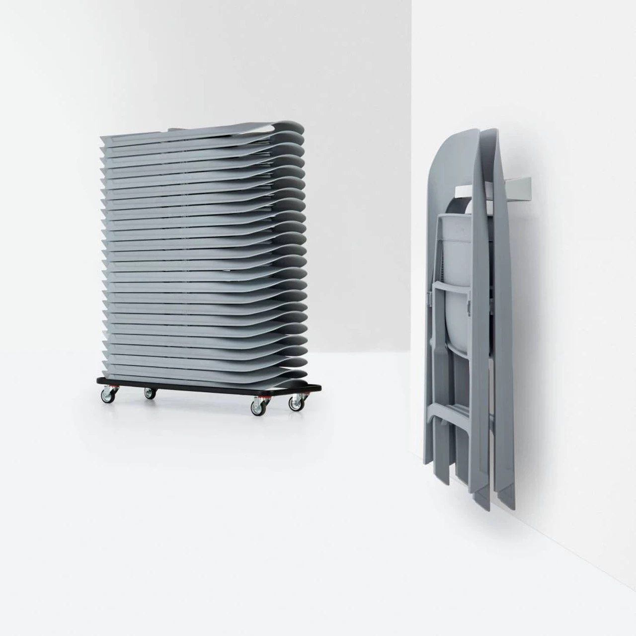 - The Flap Dolly (6777), ordered separately, supports up to 24 chairs folded and stacked flat. Includes strap to secure chairs for storage and transport