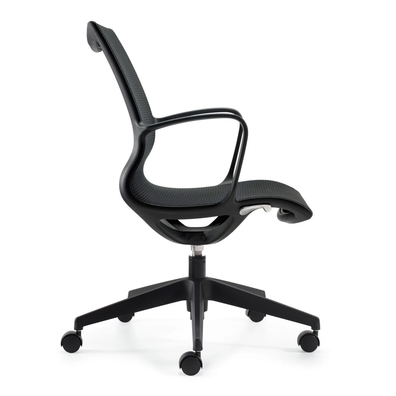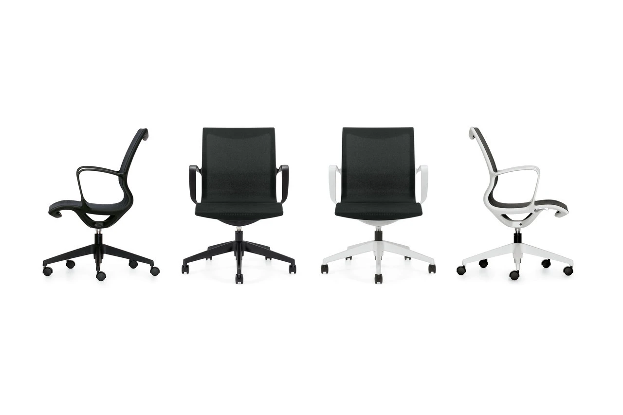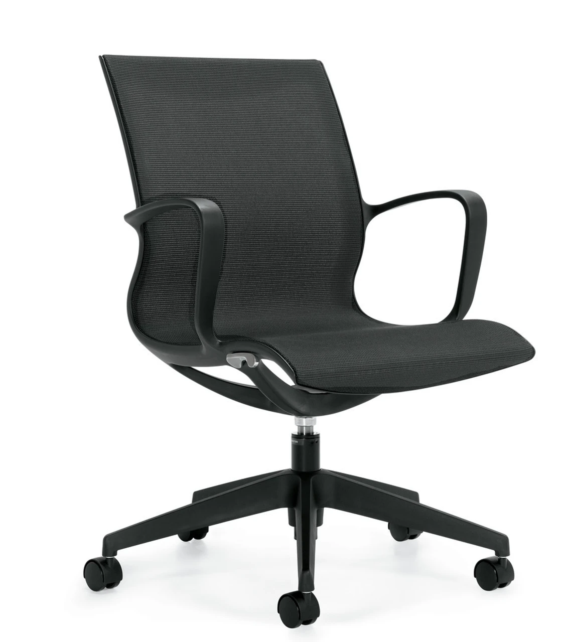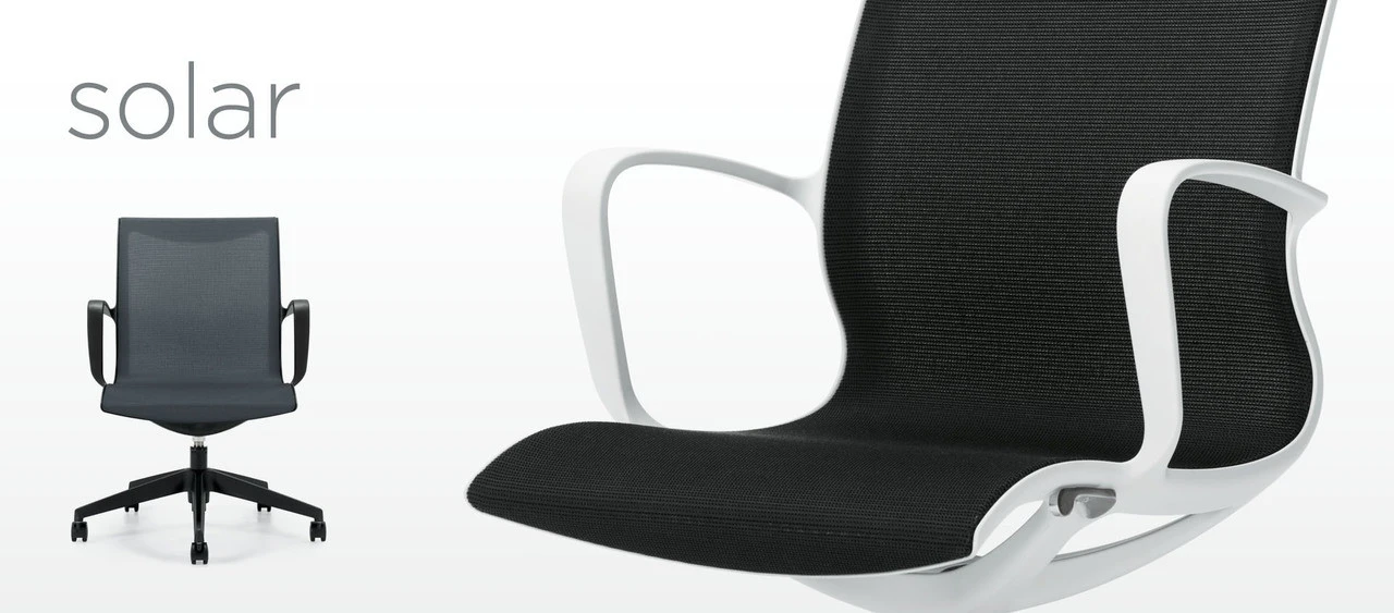This new design from Paul Brooks beautifully blends fluid structure with a mesh surface. Solar is perfect for training rooms, conference rooms and collaboration areas. Auto adjust tilt and recline mechanism adapts to the users weigh and motion. This chair is upholstered in Storm Mesh with an Asphalt frame. You can also get it in an Alabaster frame and base with Midnight Mesh.Â