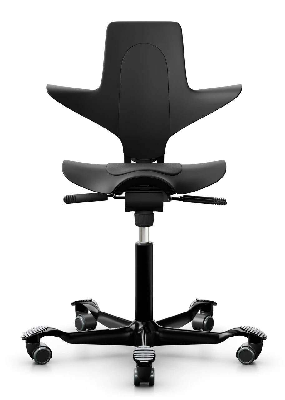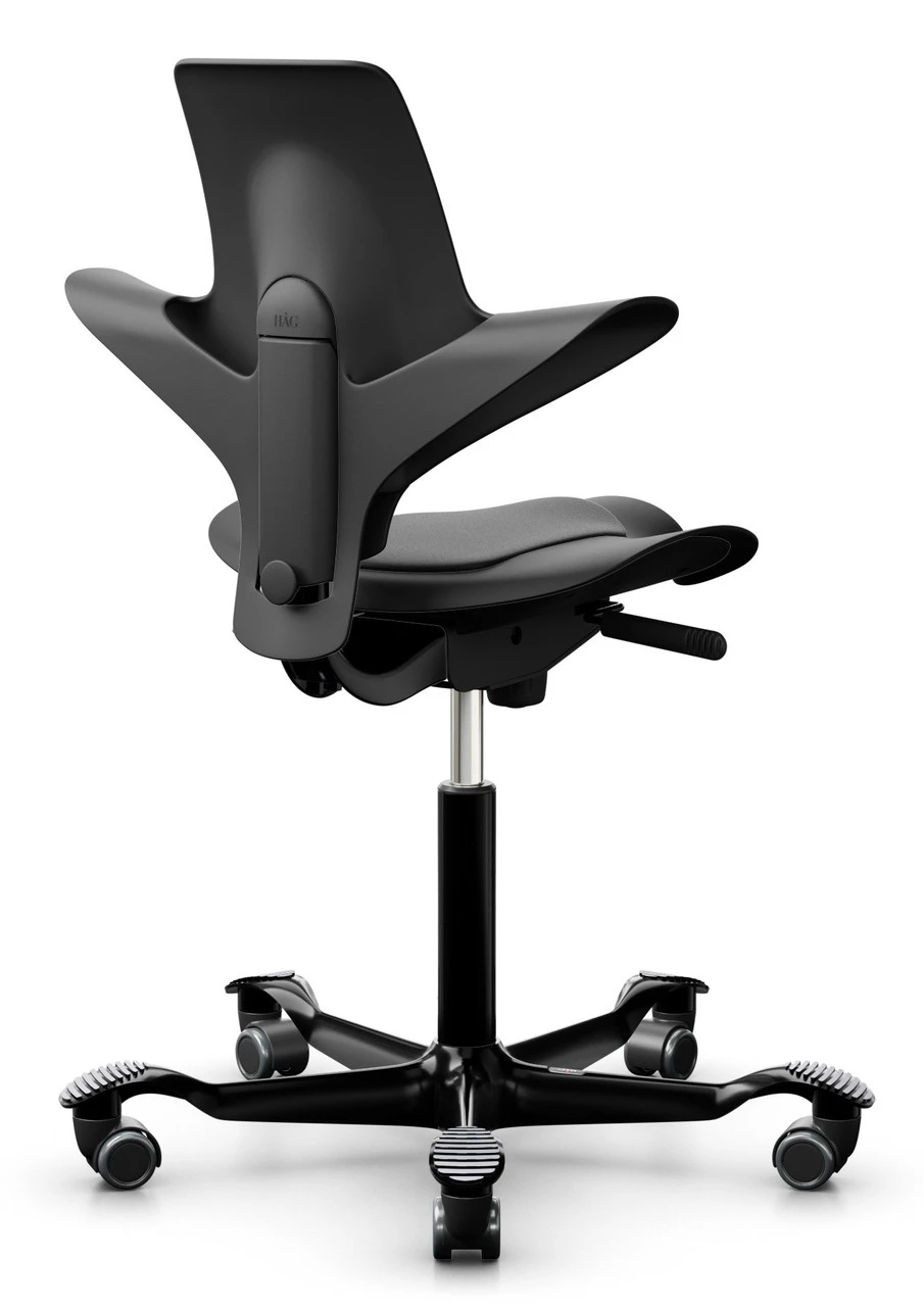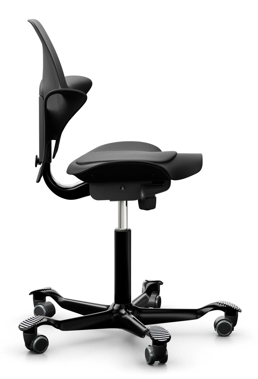 Peter Opsvik and HAG have put a new twist or spin on the highly successful upholstered Capisco saddle seat office chair from the ergonomic office seat category. In place of the original fully upholstered ergonomic seating design is a new slim and streamlined model that is more environmentally friendly and affordable. The HAG Capisco Puls 8010 saddle chair with its back support design will promote a natural saddle seating position with an open-thigh angle similar to an equestrian. This posture will improve your circulation and put you in what we call an ‘active-sitting’ position.