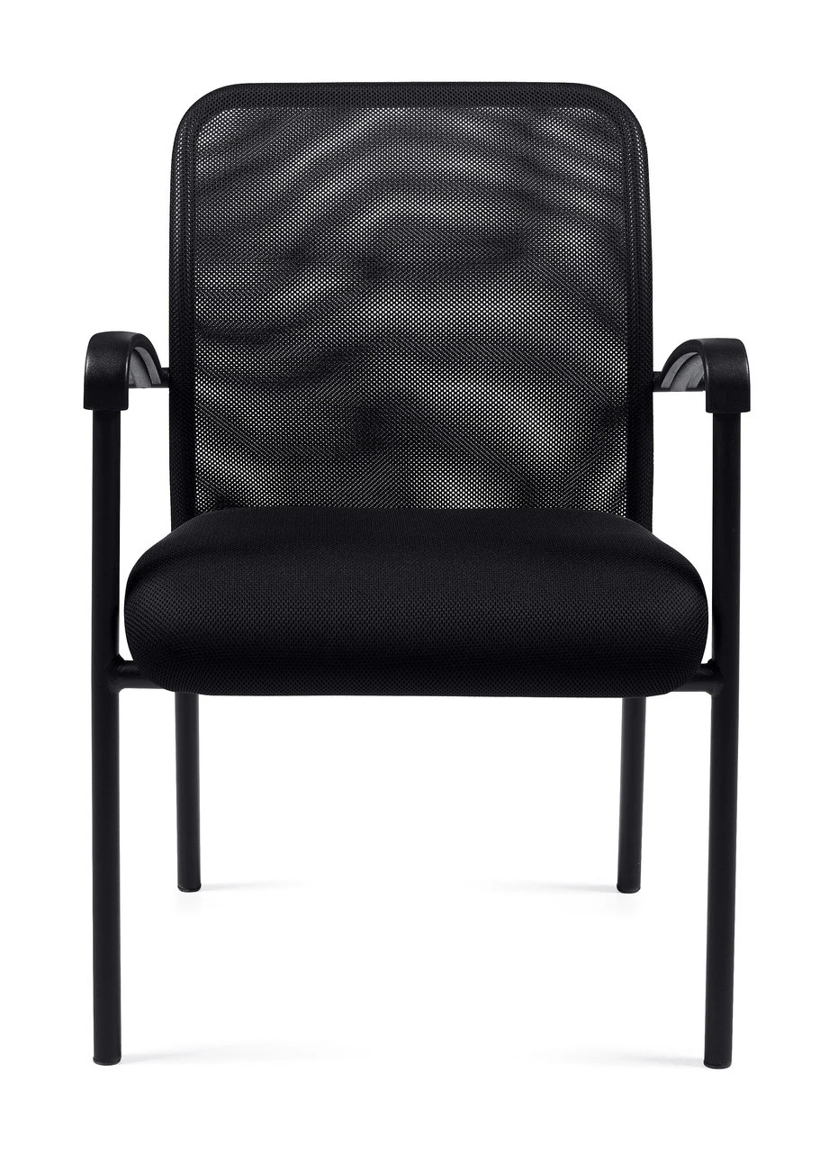 This OTG guest arm chair is a perfect companion piece for just about any black mesh task or executive chair. This product can also be used in a waiting area, break-room or collaborative space all on a budget! Chair is all over black including an epoxy coated metal frame. Backed by the 5 Year OTG by Global factory warranty. This chair cannot be stacked when not in use. Easily cleaned nylon mesh padded seat.