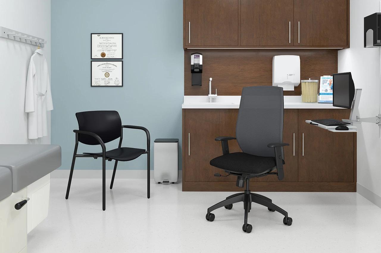 This @NCE Mesh Simple Synchro Tasker has more features than most chairs in its class: height and width adjustable arms, seat slider and ratchet back, and a weight capacity of 300 lbs. They can be cleaned with a 10:1 bleach solution. Need a fabric sample to touch and feel? Contact us. Â