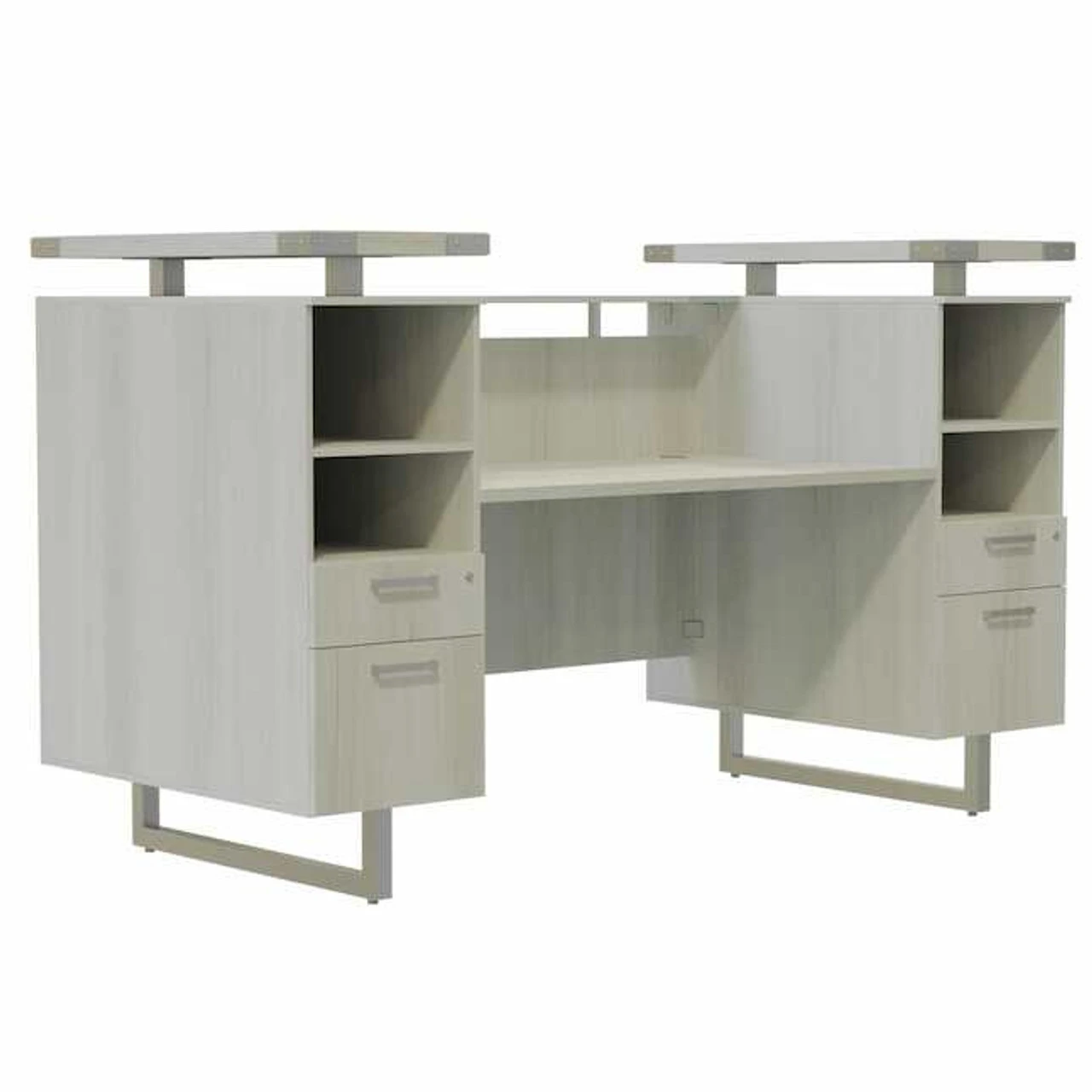 The modern design of Mayline’s Mirella™ office reception desk features a contemporary design with a residential look. Features Brushed-Silver or Black Powder Coat accents and finishes, 4 laminates and 2 glass topper colors. Two double, shelf/box/file pedestals for storage and modesty panel included. This reception desk will arrive by truck and will require some assembly.