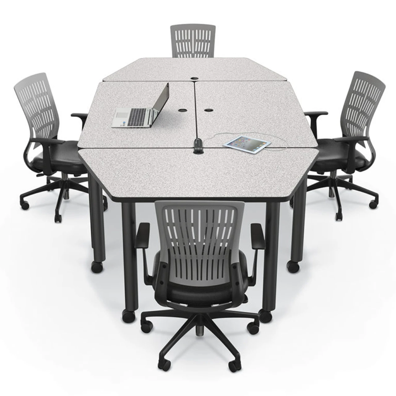 Balt Modular Conference Room Tables are perfect for conference and transitional meeting spaces as they can be broken down and endlessly re-configured! The Modular Conference Table with Trapezoid Ends by Balt can be built from modular units for multiple arrangement options. You can combine these shapes to build one of the configurations below, or get creative and build your own custom arrangement. Price includes 2 end and 2 middle rectangular pieces with options to subtract units, as desired. This modular conference table includes 2 trapezoid ends and 2 rectangular middle units.Â