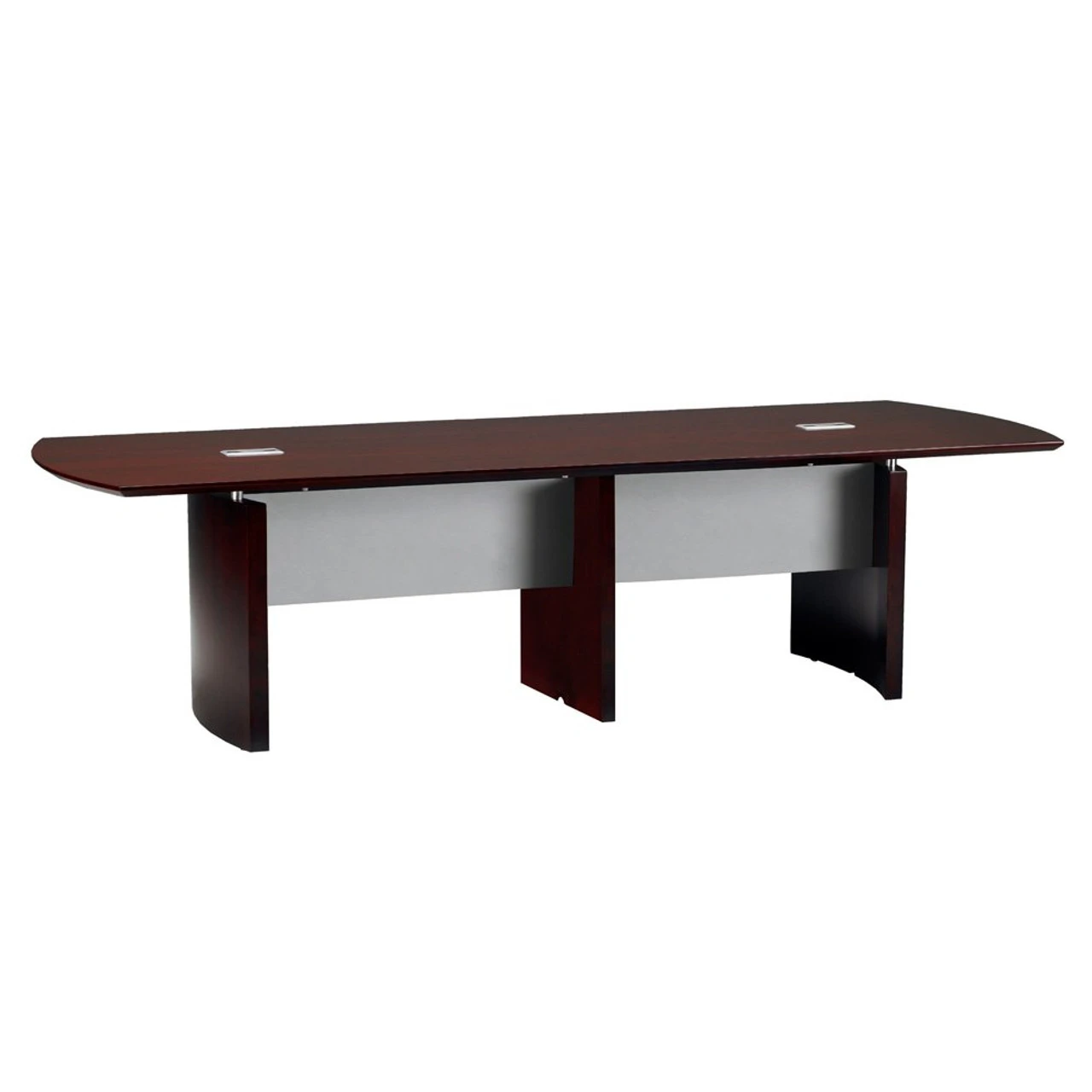 The Napoli Wood Veneer 14′ Conference Table by Mayline features Italian-influenced, sophisticated styling for business or home office. The table features elegant lines with excellent durability, made from AA-grade select North American hardwood veneers throughout. Available in 3 veneer finishes. Also featured on this table are two grommet holes 2.75″ by 6″ to insert a power outlet or snake other wires up through the table. Power modules to insert into these grommets are shown below. Easy to assemble, shipped in several pieces, three legs, two 7′ table tops and two modesty panels. Only simple tools required!Â