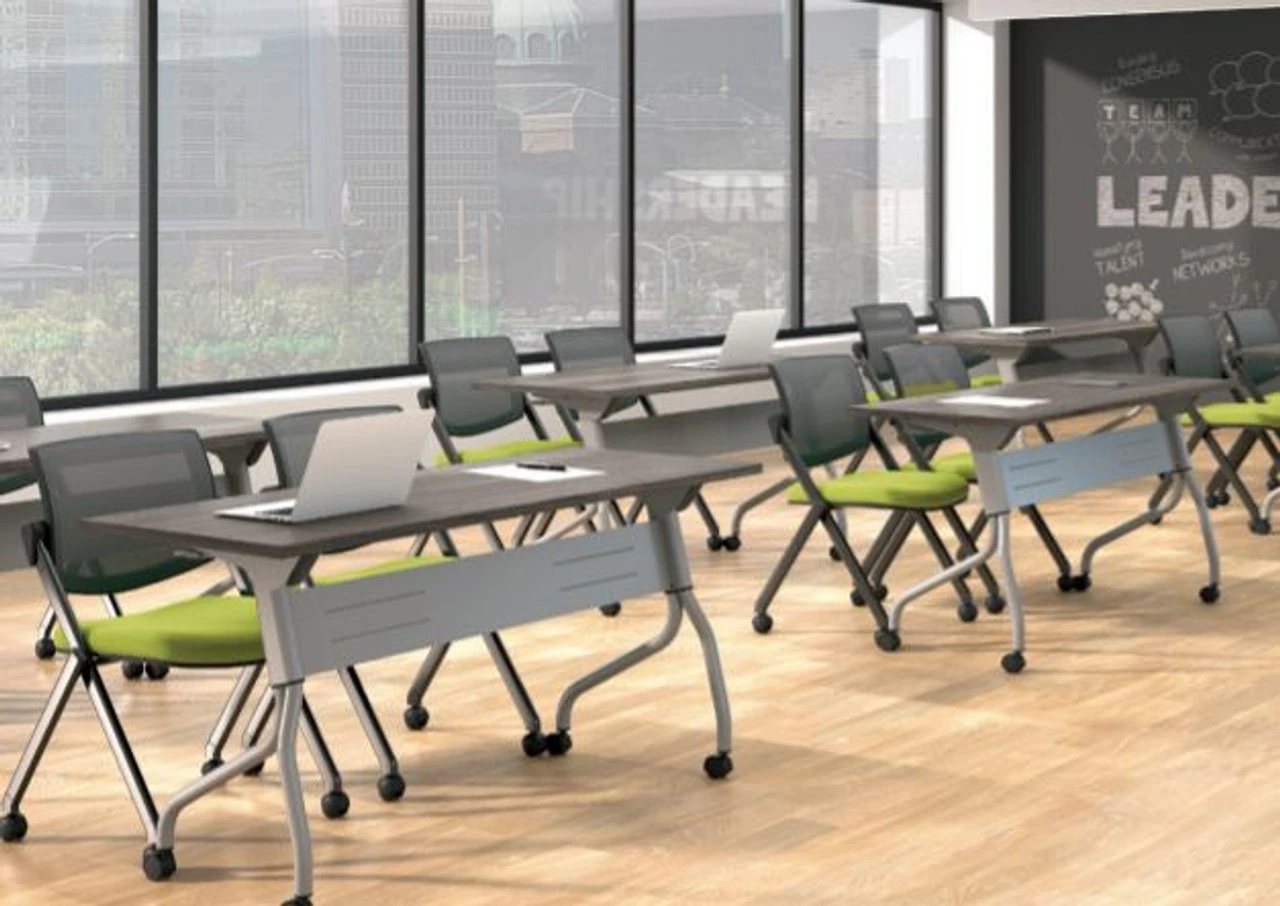 This OTG Flip-Top Training Table is a mobile nesting table that easily flips down with one lever and can be rolled, nested, and stored after use. Easy to set up, it is perfect for training rooms, seminars, educational contexts, or collaborative work areas. The metal base comes in 2 finishes, with a modesty panel included, and the flip-tops to these nesting tables are available in 5 laminates.