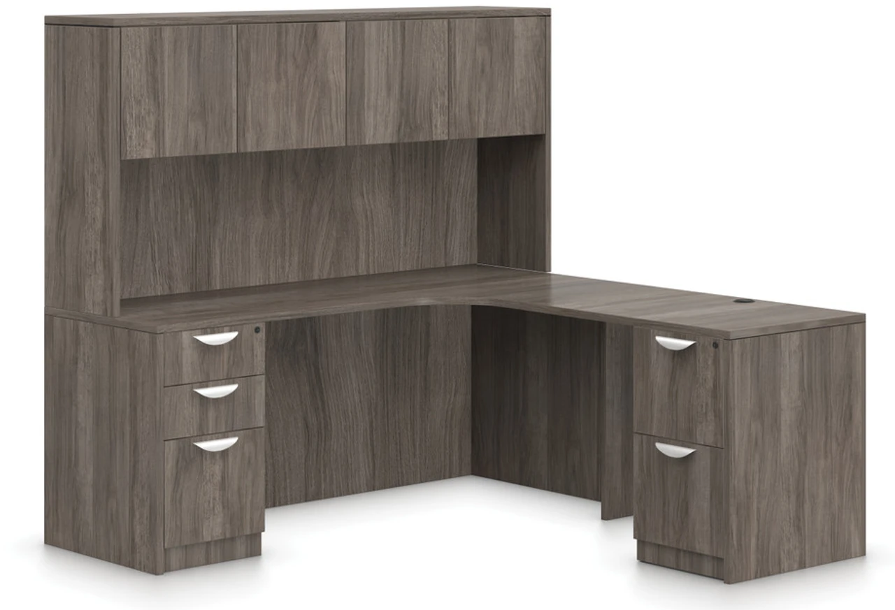 Value, value, and more value best describe this OTG SL-L Corner Desk Suite from our friends at Global. This OTG L-shaped desk with drawers features full-extension, full-height locking file pedestals with a laminate finish and easy-to-assemble desk shells. (Pedestals arrive assembled.) Metal pins and industry-approved cam fasteners make the desk shell assembly a snap. Grommets come standard on all desks and returns. The drawers on the L-shaped desk have top-quality full-extension ball-bearing slides. The 3mm matching ‘Super Edges’ on this corner desk suite protects your tops from chairs. Strong OTG factory warranty.Ā